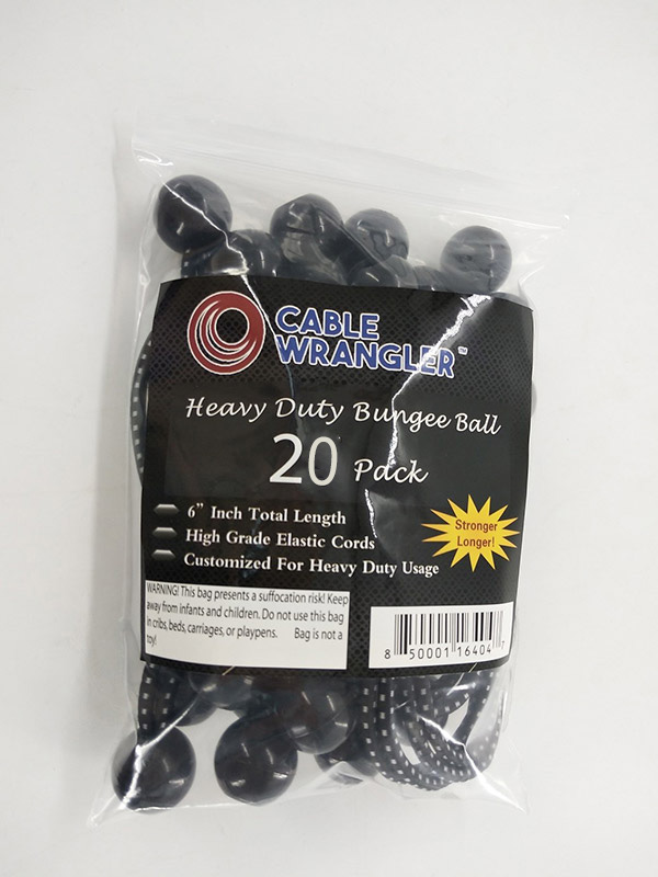 Cable Wrangler Bungee Balls are made from utility-quality materials and are made to last the wear and tear of continuous use. Whether you use them to organize amp cables while on the road, Christmas lights in the garage, or heavy-duty extension cords, you can trust our Bungee Balls will stay secure. Use Bungee Balls by themselves to secure everything from camping gear and tarps, rope, string lights, to bikes on your bike rack. Effortlessly organize cables, ropes, guitar cords, computer cables, and more with our cable management product, and use as an effective and reliable studio and stage cable management system. Buy our custom Bungee Balls today!