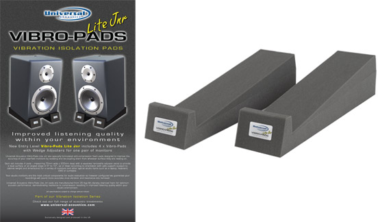 Universal Acoustics Vibro-Pads Lite Jnr are specially formulated anti-compression foam pads designed to improve the accuracy of your nearfield monitors by isolating and de-coupling them from whatever surface they are resting on. Each set includes 4 pads – measuring 75mm wide x 300mm deep with a separate removable adjuster panel to provide a level surface or an angled slope of 5o to 10o, up or down according to orientation with safe support (subject to cabinet weight and dimensions) for a variety of monitors and other typical studio items such as a laptop, keyboard, DVD or turntable. Your studio monitors are the most critical components for audio evaluation so however configured we guarantee your recordings will sound more accurate once vibration and resonance are removed. Universal Acoustics Vibro-Pads Lite Jnr pads are manufactured from 35 Kgs M3 density charcoal foam for optimum acoustic performance, demonstrating resilience to compression resulting in improved listening quality within your studio environment. (all specifications subject to change without notice)